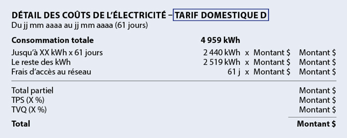 Par exemple, si votre période de consommation est de 62 jours, vous avez droit à 2 480 kWh au prix de la première tranche (40 kWh par jour X 62 jours = 2 480 kWh). Le reste de l’énergie sera facturée au prix de la deuxième tranche, s’il y a lieu.