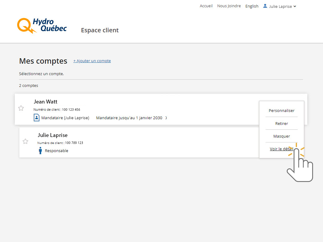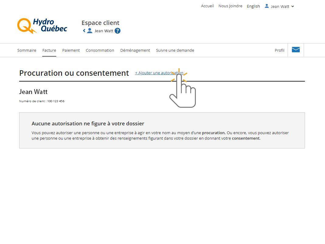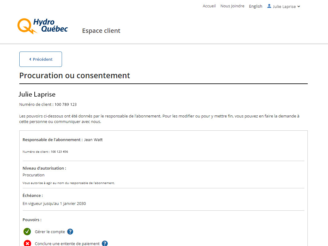 En tant que responsable d’un abonnement au service d’électricité, vous pouvez maintenant désigner dans votre Espace client un tiers – enfant, parent, conjoint, ami ou entreprise – pour lui permettre d’obtenir des renseignements sur votre compte d’électricité (consentement) ou d’agir en votre nom auprès d’Hydro-Québec (procuration).