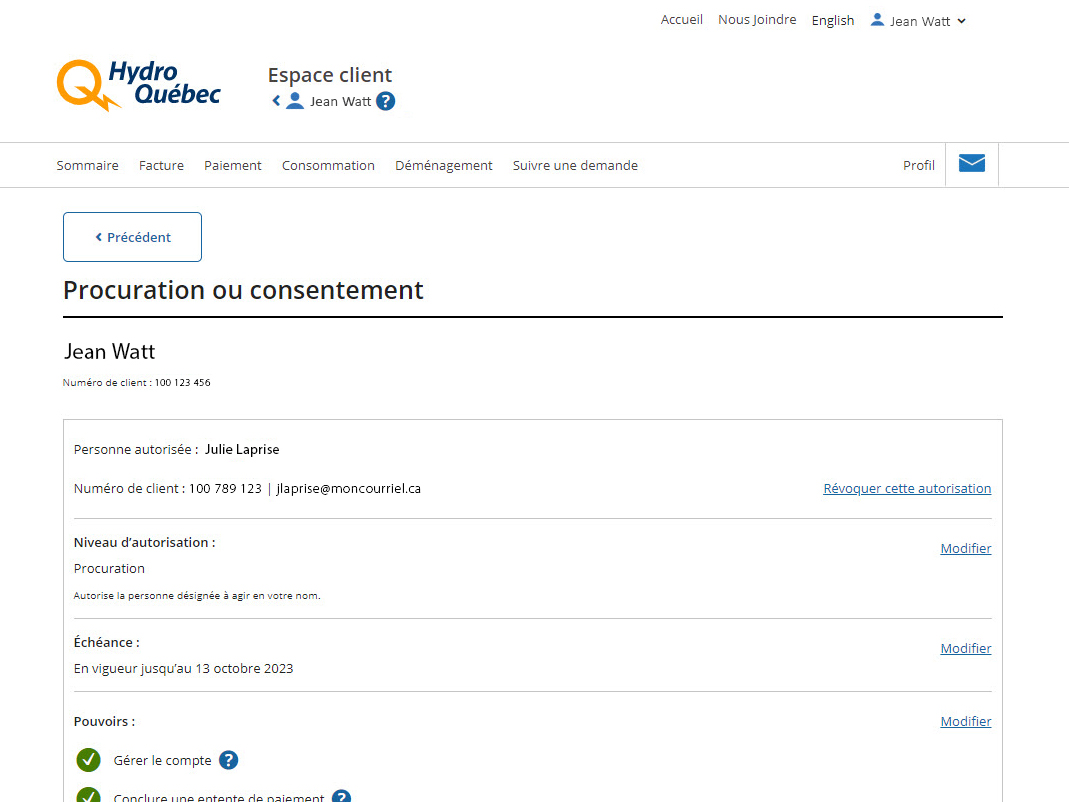 Il suffit d’aller dans votre Espace client, de choisir le type d’autorisation (procuration ou consentement), de préciser les pouvoirs accordés à cette personne ou à cette entreprise (obtenir des renseignements, gérer votre compte, modifier les renseignements inscrits dans votre dossier, signaler votre déménagement, etc.) et d’établir la date d’échéance de l’autorisation.
