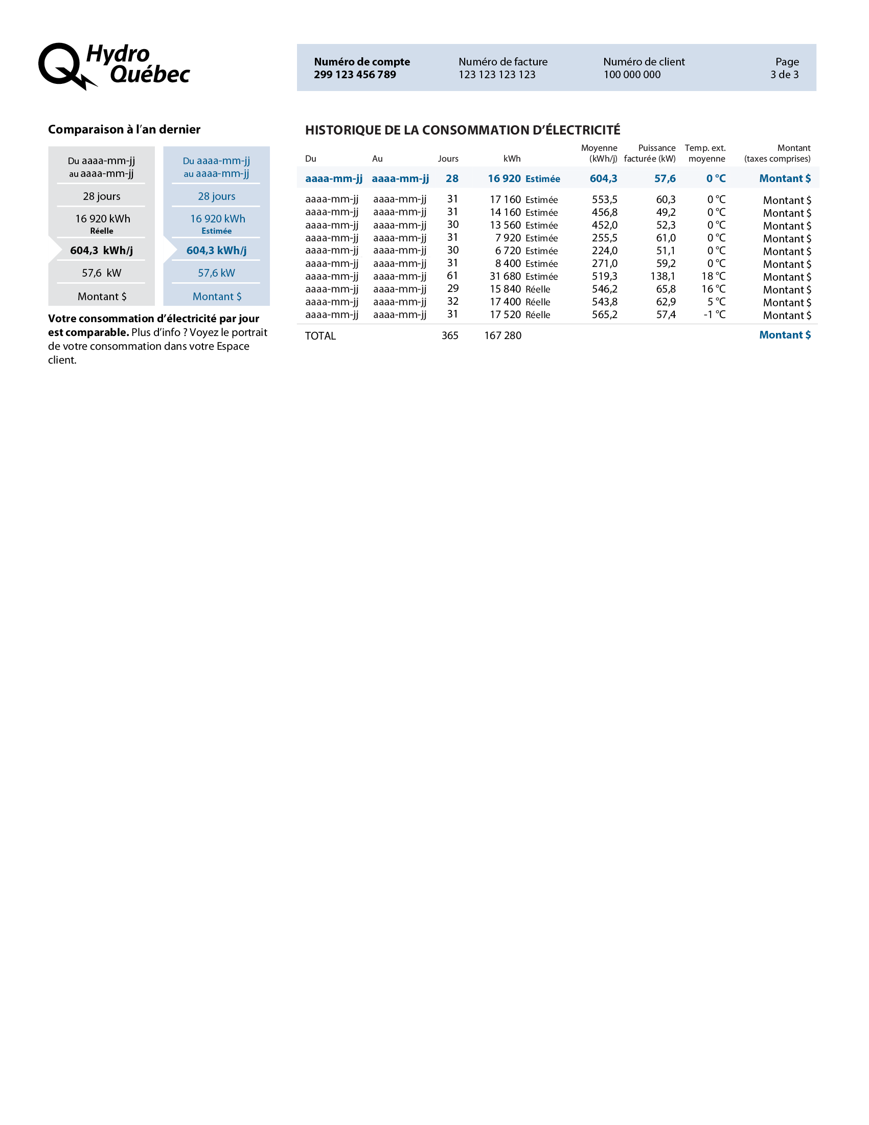 Calcul détaillé des coûts de la puissance facturée et de l’électricité consommée selon le tarif applicable et le nombre de jours, ainsi que des crédits, des autres frais (le cas échéant) et des taxes. Ce total est reporté à la page 1, sous la rubrique Sommaire de la présente facture.