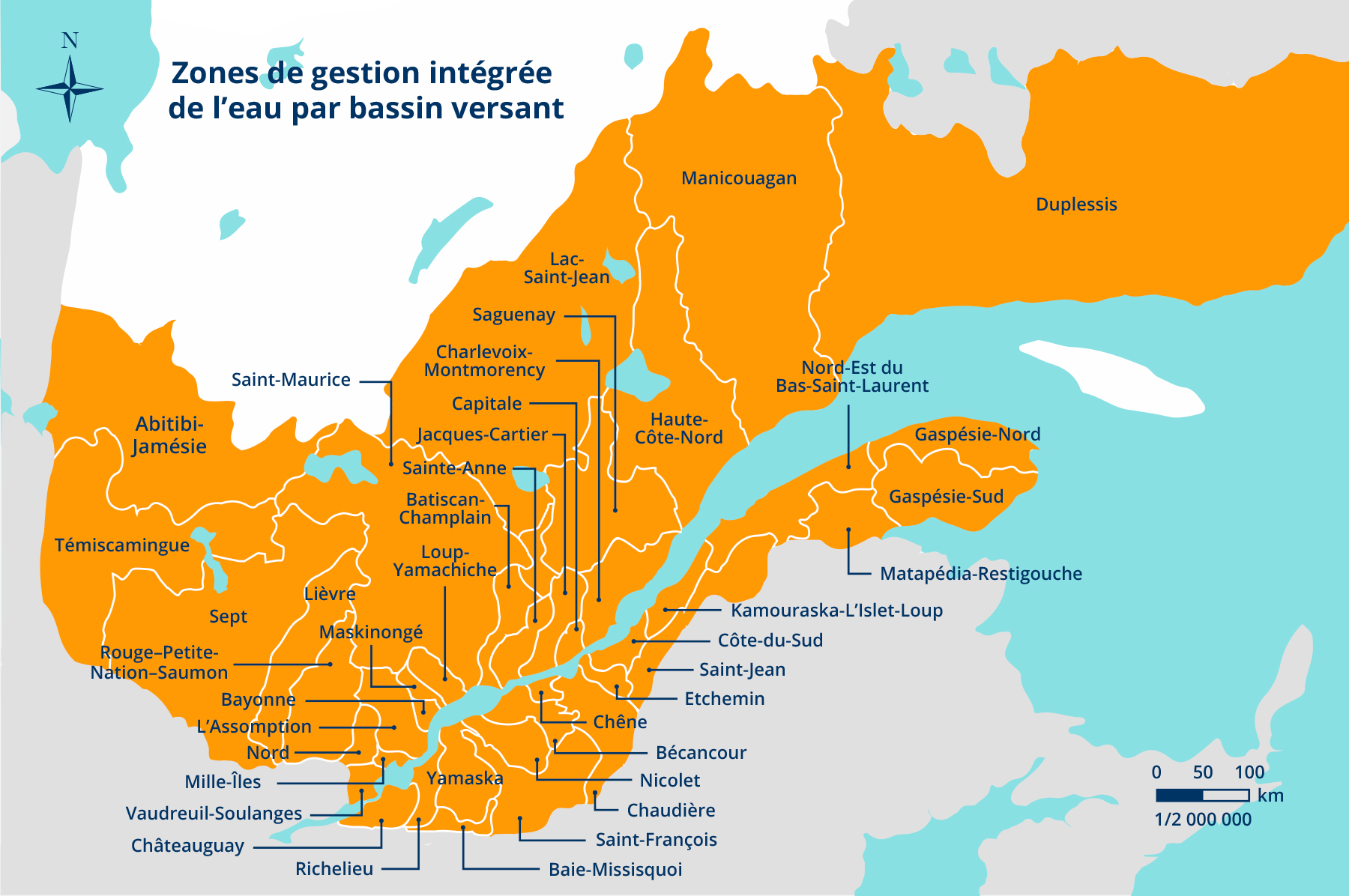 Le Québec contient 430 bassins versants majeurs. De ce nombre, une centaine ont une superficie supérieure à 4 000 km2. La gestion intégrée des ressources en eau par bassin versant est un processus permanent, supervisé par le Ministère du Développement durable, de l’Environnement et de la Lutte contre les changements climatiques .