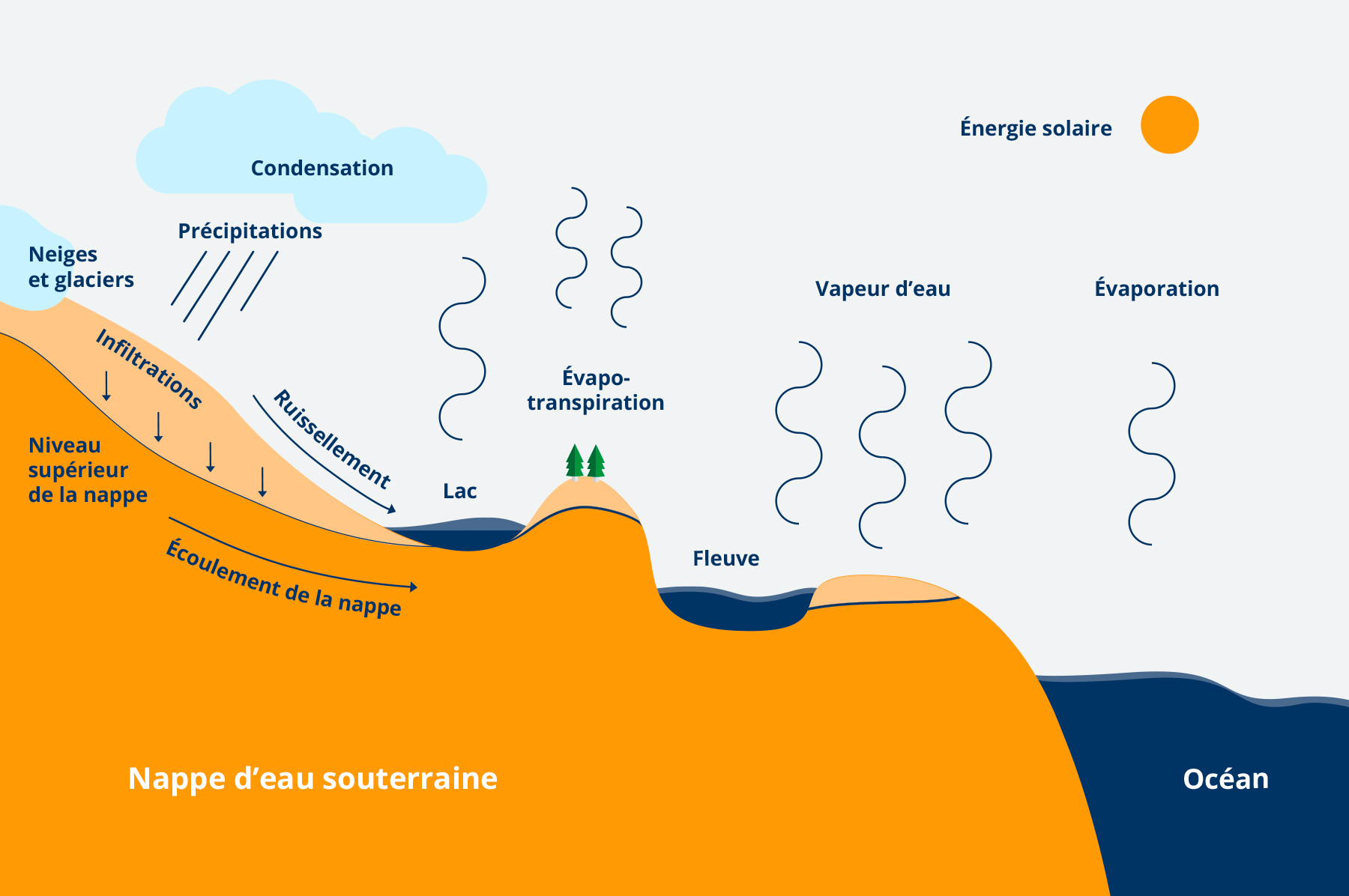 L’eau s’inscrit dans un cycle hydrologique. En réchauffant les océans, les lacs et les rivières, le soleil provoque l’évaporation de celle-ci. La vapeur d’eau s’élève ensuite dans l’atmosphère où elle se condense et se transforme en nuages. Quand la condensation ou l’humidité atteint un maximum, les nuages laissent échapper des gouttelettes d’eau qui retombent sous forme de pluie ou de neige. L’eau revient donc sur la terre et retourne vers les lacs, les rivières et les océans, puis le cycle recommence.