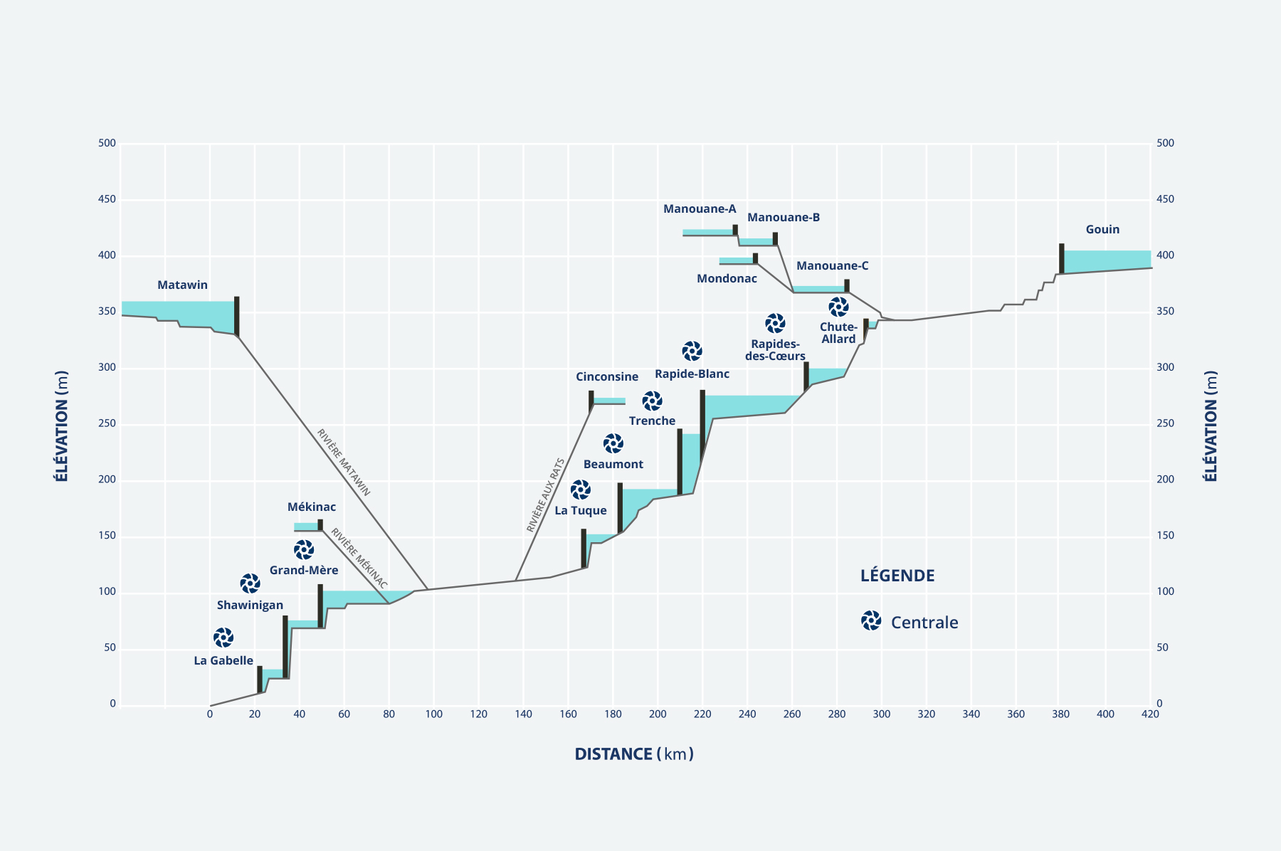 Avec son débit important et ses hauteurs de chute élevées, la rivière Saint-Maurice comporte plusieurs endroits propices à la construction d’une centrale hydroélectrique. Une centrale est une usine où l’on produit de l’électricité en utilisant l’eau comme force motrice pour faire tourner des turbines qui entraînent à leur tour des alternateurs. Sur la rivière Saint-Maurice, à l’exception de la centrale du Rapide-Blanc, toutes les centrales sont au fil de l’eau. Elles sont donc alimentées directement par un cours d’eau et ne disposent d’aucune réserve – d’où l’importance de la construction du réservoir Gouin.