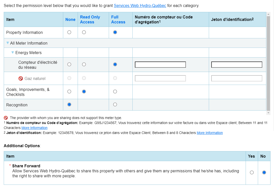 For the selected property(ies), choose Full access. In the table, on the Hydro-Quebec Web Services line, select Data exchange.