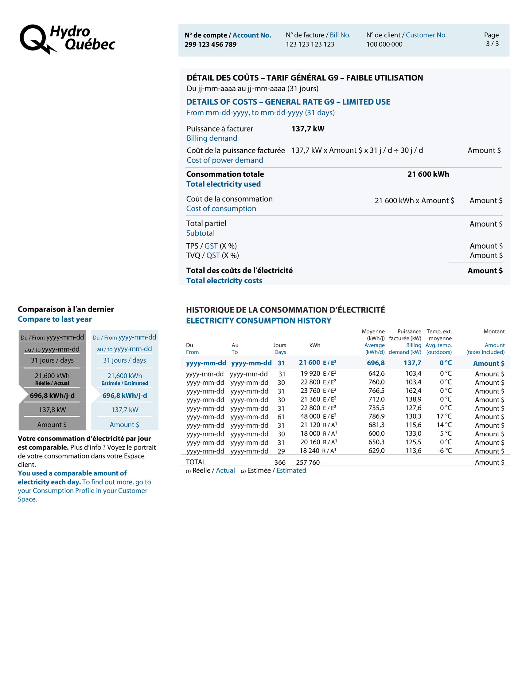 This bill is issued once a year. It presents your actual consumption, indicates any balance payable and informs you of your new monthly installment amount.