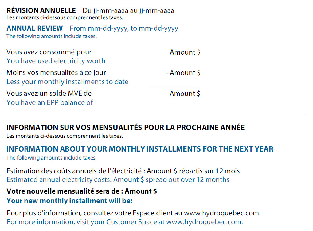 Your annual review shows your actual consumption, indicating your EPP balance for the year just ended – a credit or a balance payable – as well as the amount of your monthly installments for the next year