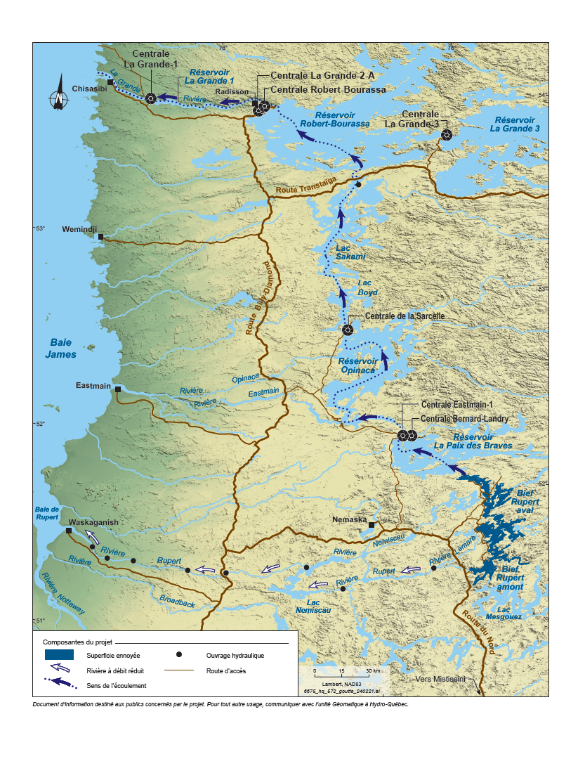 - Grâce à 4 canaux, l’eau dérivée de la Rupert peut atteindre le bassin versant de la rivière Lemare et limiter le niveau maximal des plans d’eau et des superficies ennoyées.