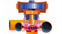 L'eau parvient au groupe turbine-alternateur par la conduite forcée qui l'achemine à la bâche spirale (conduit en colimaçon). Elle fait tourner les aubes et se dirige ensuite vers l'axe de la turbine pour s'écouler dans l'aspirateur situé en dessous. L'énergie mécanique produite par la puissante pression exercée par l'eau sur la turbine est transmise à l'alternateur qui la transforme en énergie électrique.