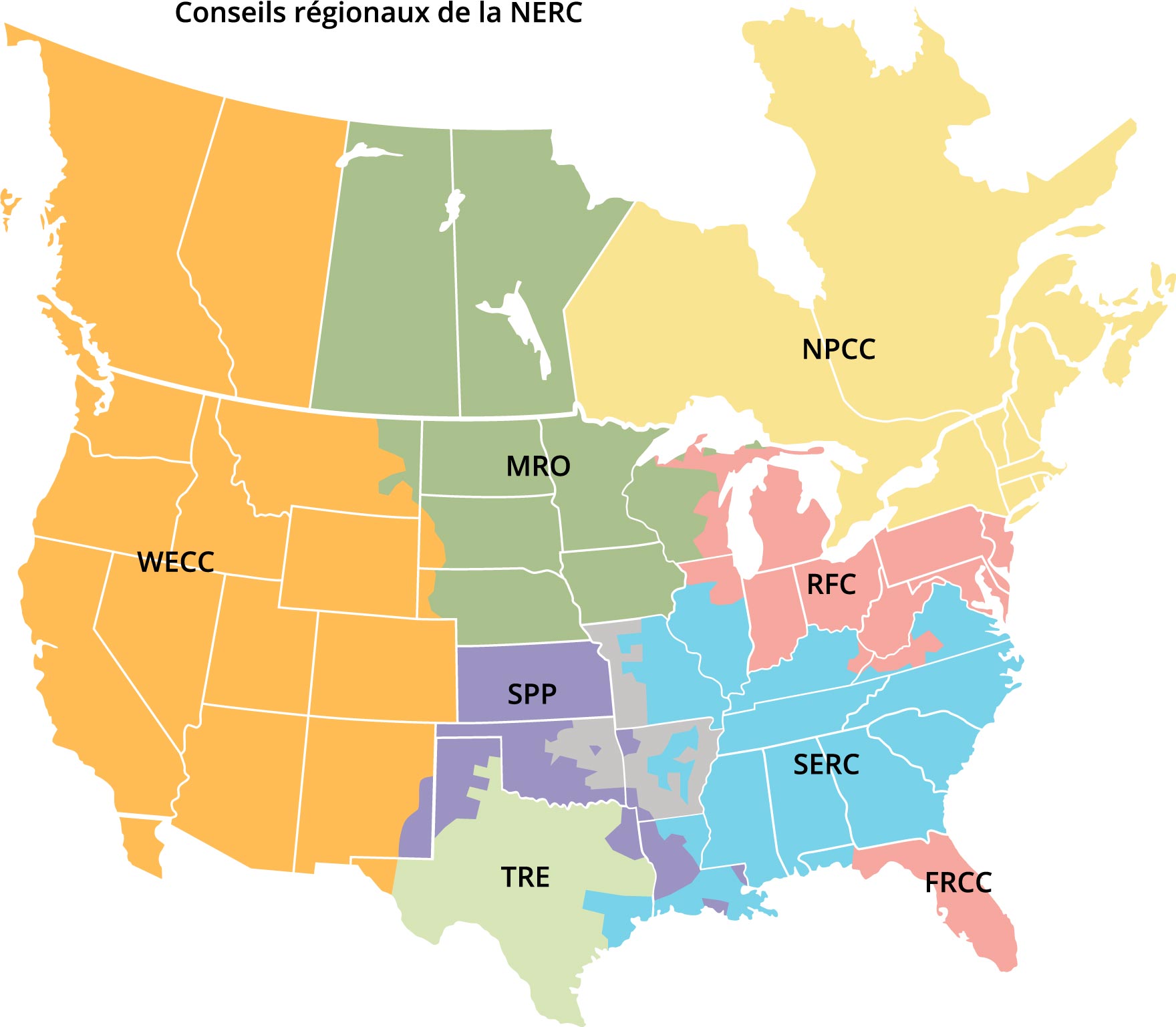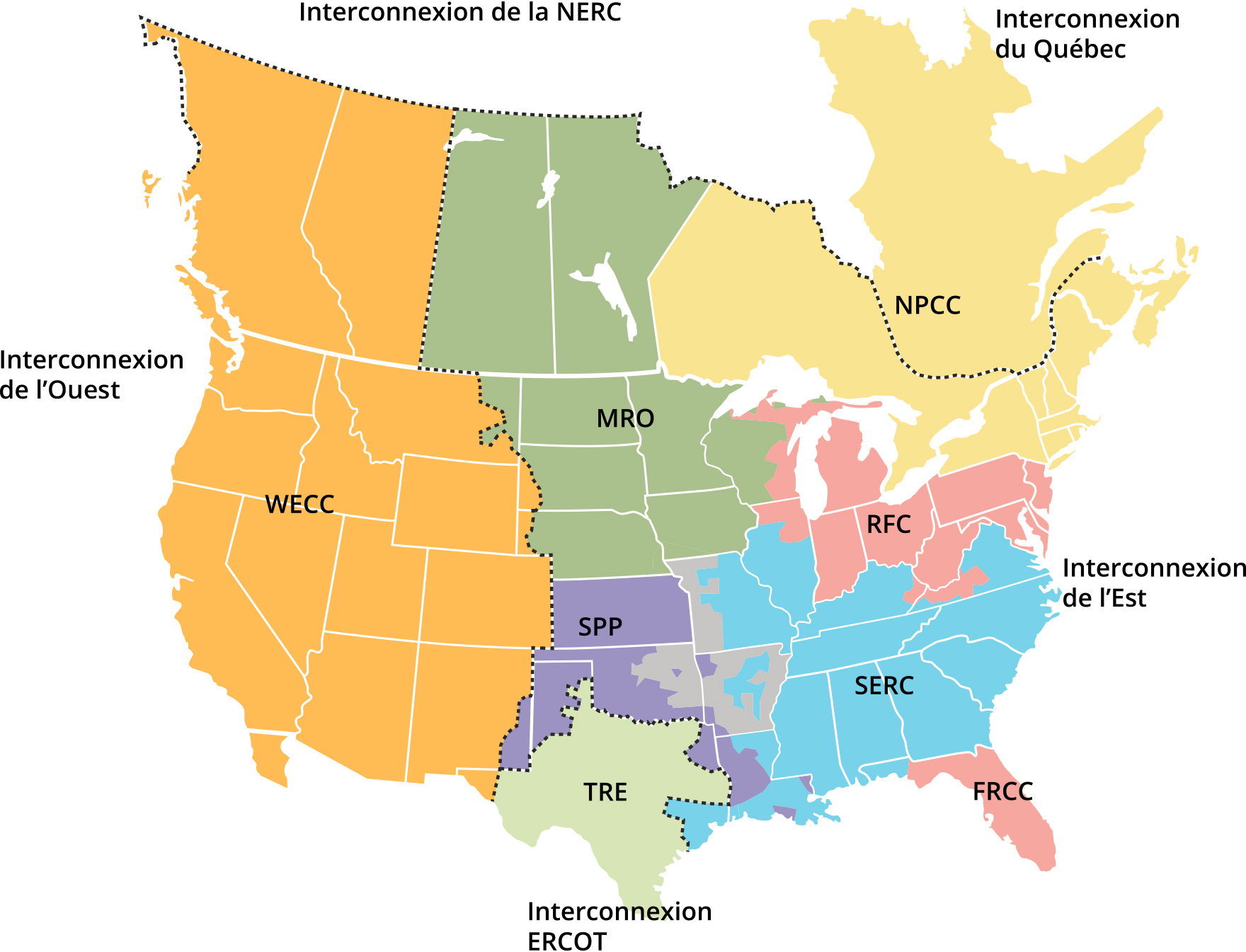 Les réseaux de transport d’électricité visés par les normes de fiabilité de la NERC sont regroupés en quatre grands ensembles de réseaux interconnectés appelés « Interconnexions » :