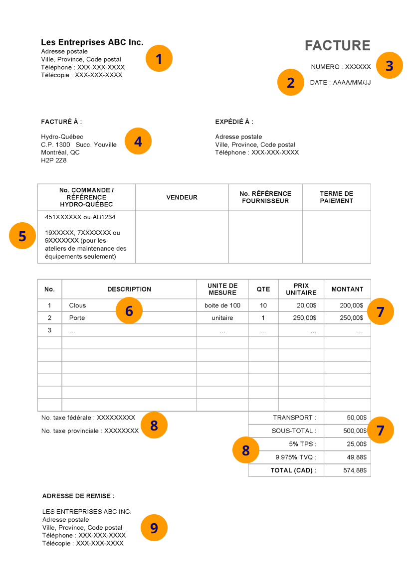 Si vous avez fourni un bien ou un service à Hydro‑Québec ou à la Société d’énergie de la Baie James (SEBJ), voici comment préparer et transmettre votre facture.