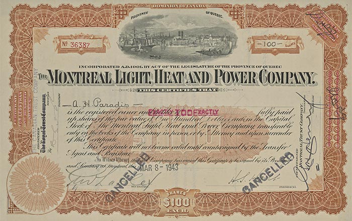 Certificat d’actions de la Montreal Light, Heat and Power Consolidated. La Commission hydroélectrique de Québec a fait une offre d’achat aux actionnaires de l’entreprise lors de la nationalisation, en 1944.