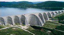 This multiple-arch-and-buttress dam is truly unique. Inaugurated in 1969, it was named after Québec's Premier at the time, Daniel Johnson. Its reservoir is four times the size of the Island of Montréal. Its construction, spread over a 10-year period, required 2.2 million cubic metres of concrete, the equivalent of a regular sidewalk linking the North and South Poles. In 2000, Canada Post issued a stamp in honor of this structure. The reservoir supplies water to Manic-5 and Manic-5-PA power stations.