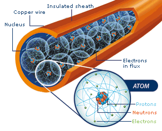 Each atom has a nucleus surrounded by a definite number of electrons. An electron is a particle of negative energy that revolves around the nucleus as a satellite does around the Earth. The electrons of certain materials, such as copper, aluminum and other metals, can easily leave their orbits; these materials are called conductors.