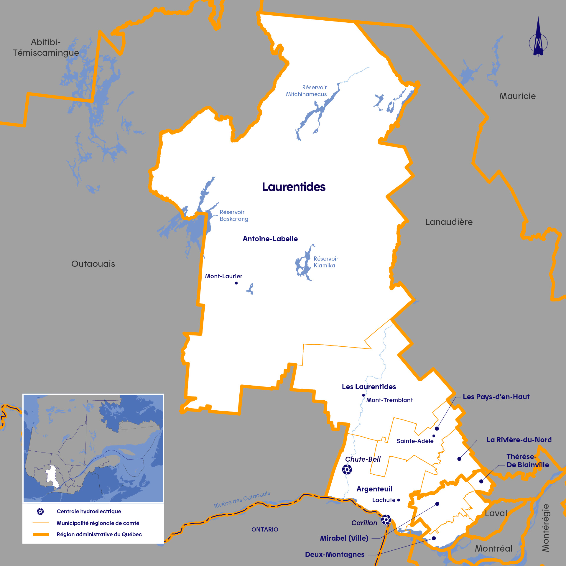 Hydro-Québec compte deux centrales dans la région des Laurentides : la centrale de Carillon, sur la rivière des Outaouais, et la centrale de la Chute-Bell, sur la rivière Rouge, un affluent de la rivière des Outaouais. Toutes deux sont des centrales au fil de l’eau, ce qui signifie qu’elles ne permettent pas de retenir ou de stocker de l’eau dans un réservoir.