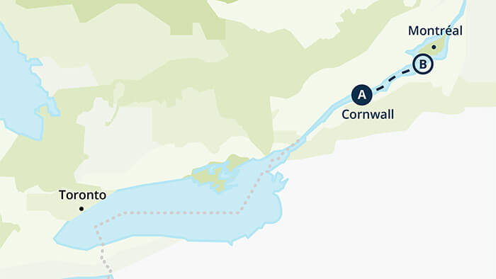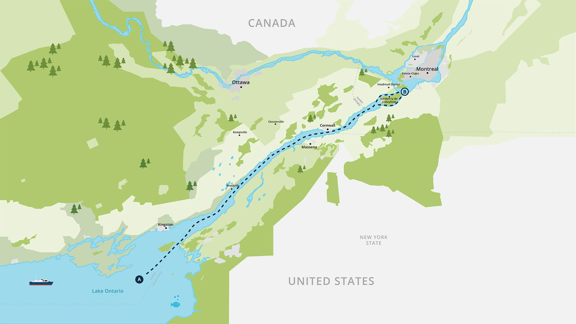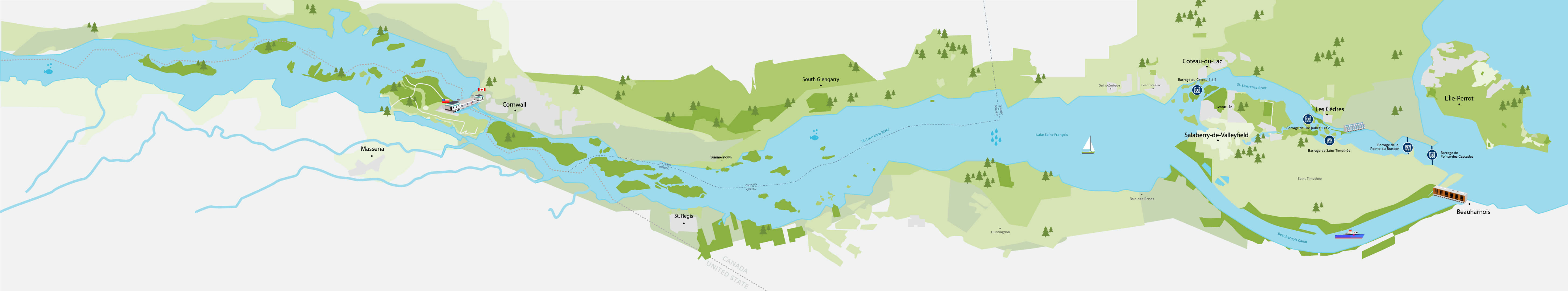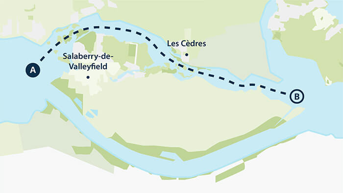 From point A to point B, the water of the Fleuve Saint-Laurent (St. Lawrence River) travels approximately 250 km. Below are the stages it travels through from its departure from Lake Ontario to its arrival in Lac Saint-Louis, at the exit of the Beauharnois–Les Cèdres complex.