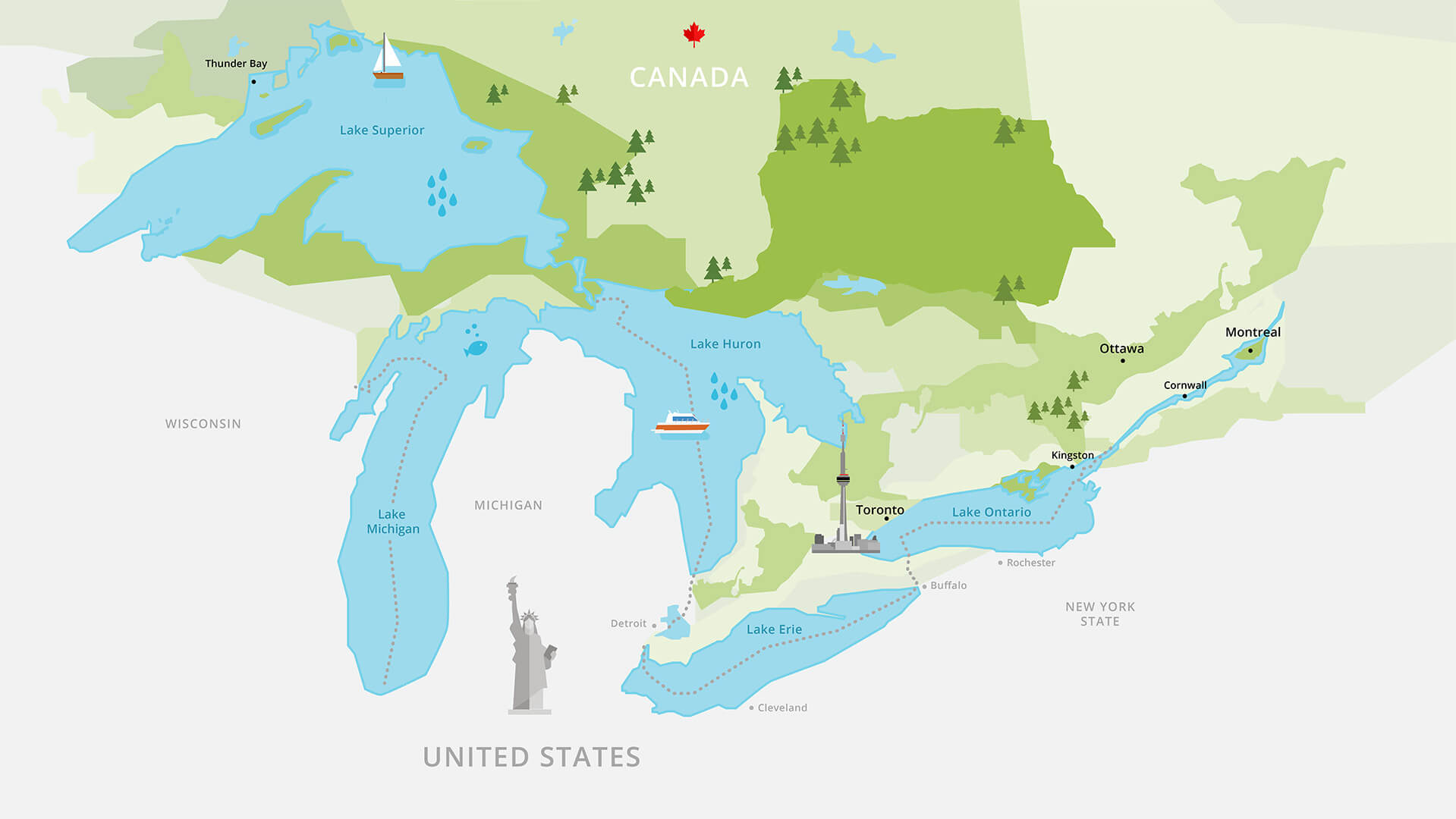 The storage capacity of the Great Lakes is 22,950 billion cubic metres of water, or the equivalent of over six million Olympic pools.