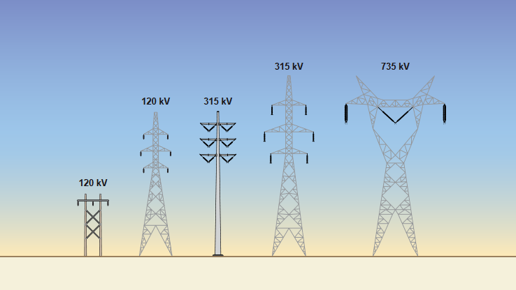 Le choix des pylônes dépend d’abord de la tension et du nombre de conducteurs nécessaires pour acheminer l’électricité requise. De façon générale, plus la tension de la ligne est élevée, plus les pylônes sont hauts et plus l’emprise est large.