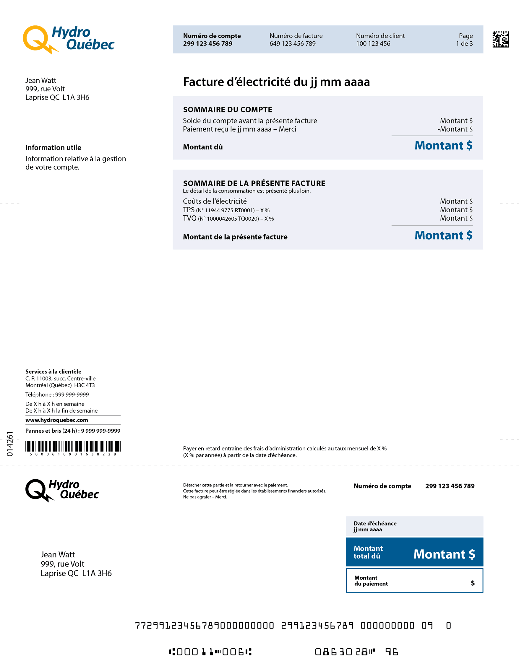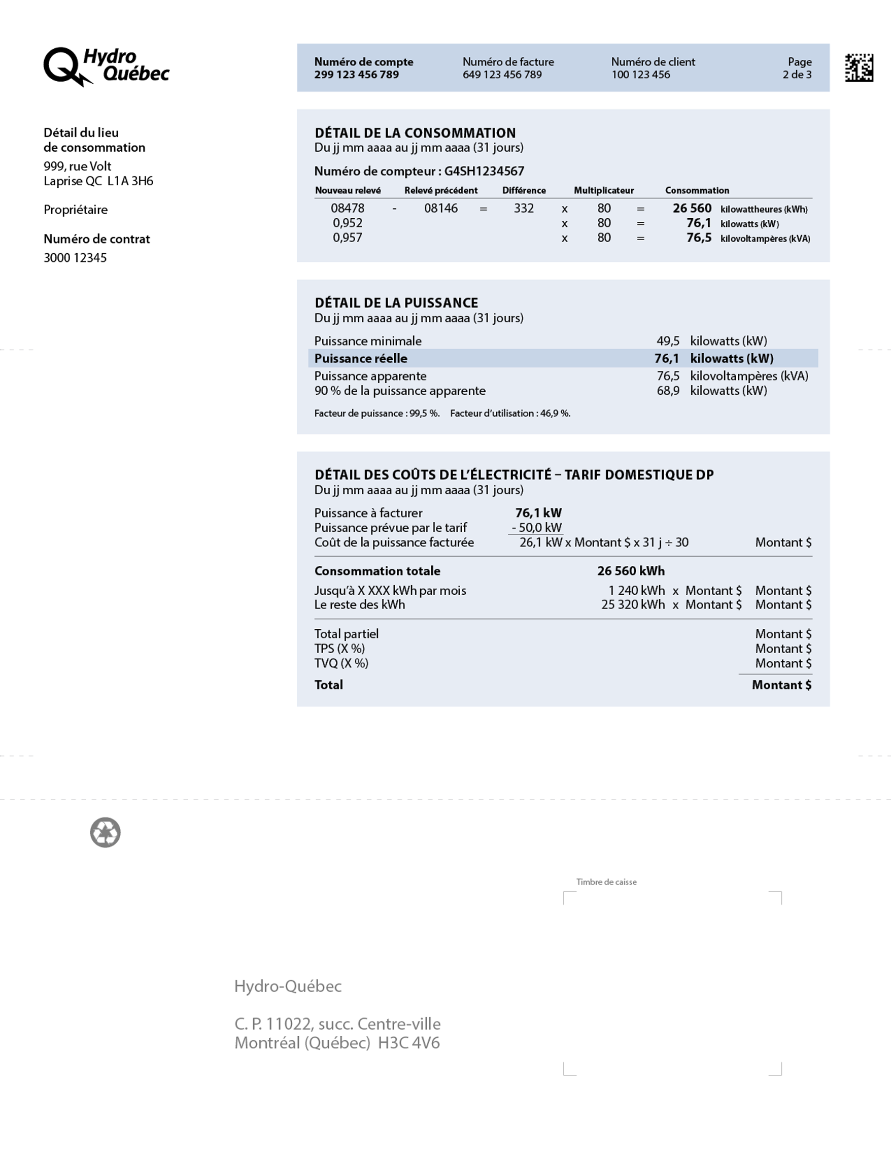 Calcul détaillé des coûts de la puissance facturée et de l’électricité consommée selon le tarif applicable et le nombre de jours, ainsi que des crédits, des autres frais (le cas échéant) et des taxes. Ce total est reporté à la page 1, sous la rubrique Sommaire de la présente facture.