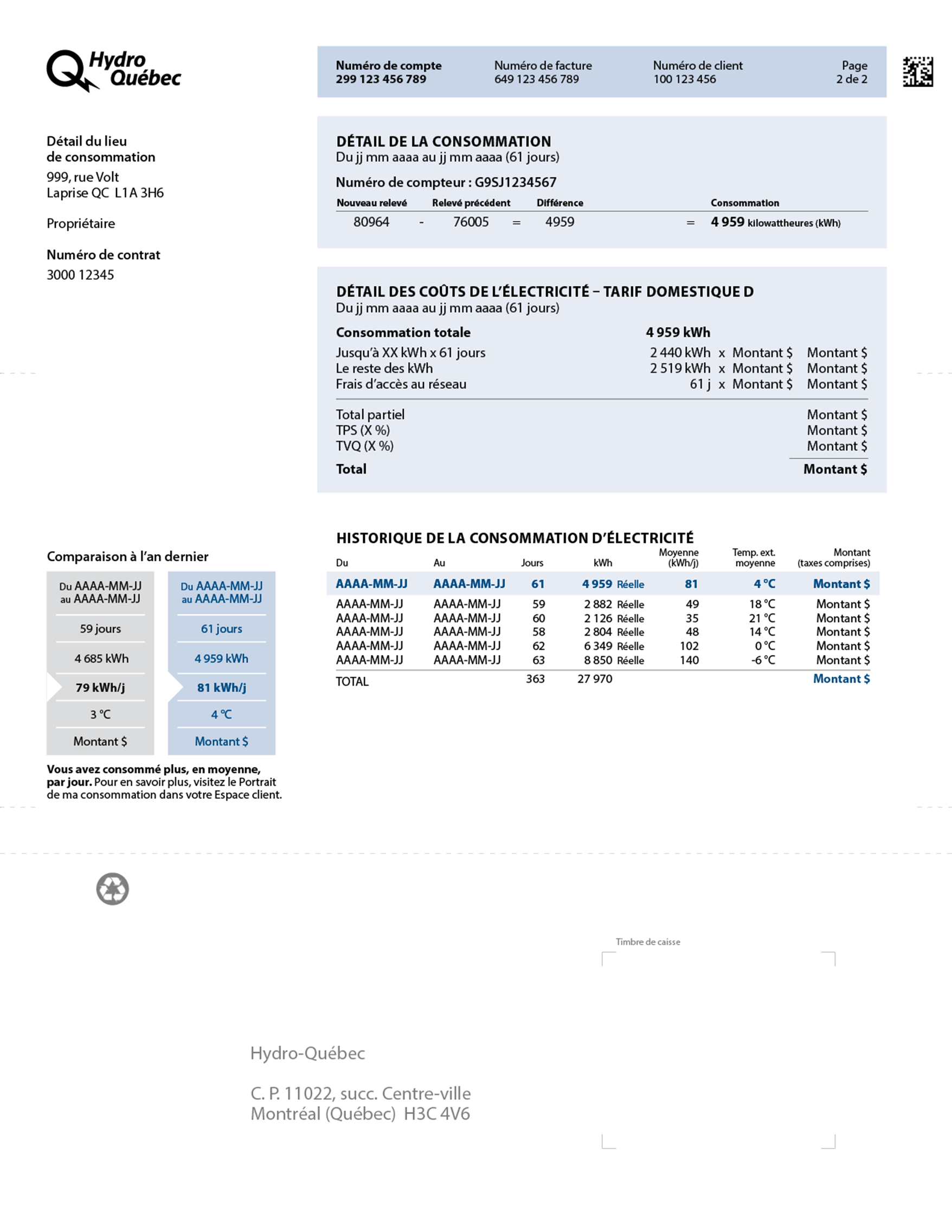 Calcul détaillé des coûts de l’électricité consommée selon le tarif applicable et le nombre de jours, ainsi que des crédits, des autres frais (le cas échéant) et des taxes. Ce total est reporté à la page 1, sous la rubrique Sommaire de la présente facture.