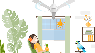 Une femme allongée sur une chaise se rafraîchit sous un ventilateur, ce qu’elle devra faire pendant 20 heures pour consommer 1 kWh.