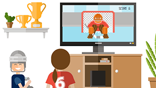 Deux enfants jouent à un jeu vidéo sur une console de jeu, ce qu’ils devront faire pendant 6 heures pour consommer 1 kWh.
