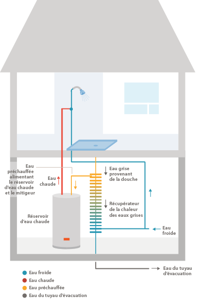 Un système de RCEG utilise une technologie éprouvée pour exploiter l’énergie résiduelle des eaux circulant dans les tuyaux d’évacuation afin de préchauffer l’eau d’alimentation du chauffe-eau. Il offre plusieurs avantages : il réduit de 20 à 40 % le coût du chauffage de l’eau pour les douches, s’installe facilement, nécessite peu d’entretien et a une durée de vie de 30 à 50 ans.