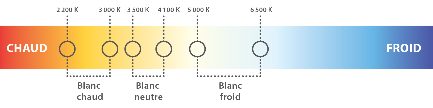 Les termes « blanc chaud », « blanc froid » ou « lumière naturelle » correspondent à des températures de couleur qui se mesurent en kelvins (K), par exemple 2 700 K. Plus le nombre de kelvins est élevé, plus la lumière est blanche ou froide. À l’inverse, plus le nombre de kelvins est faible, plus la lumière est jaunâtre ou chaude. Si vous souhaitez une couleur qui se rapproche de la lumière que produit une ampoule à incandescence, optez pour une ampoule de 2 700 K à 3 000 K.