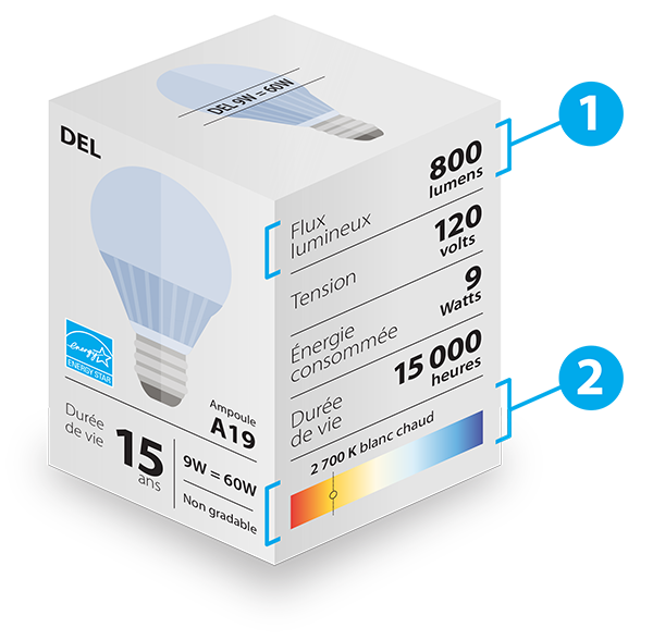Il est préférable d’utiliser le lumen (lm) pour déterminer l’intensité lumineuse d’une ampoule. En effet, le nombre de watts est un indicateur moins fiable pour les ampoules à DEL. De plus, la technologie des ampoules à DEL évolue et permet d’utiliser moins de watts pour créer la même intensité lumineuse.