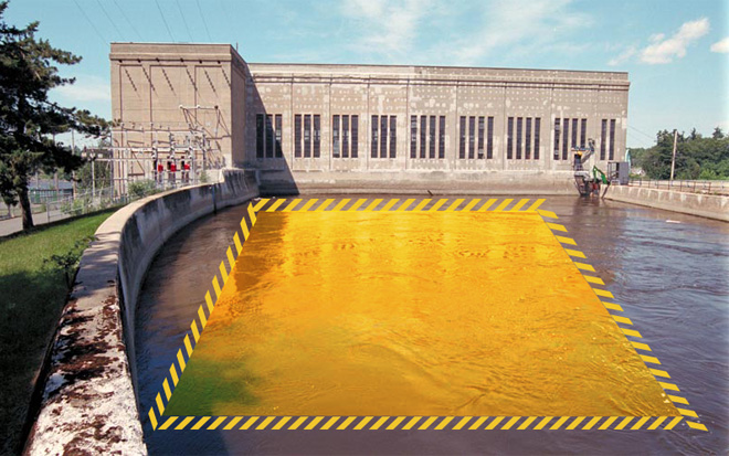 En aval d’une centrale, l’eau est agitée quand les turbines fonctionnent. Si les turbines sont arrêtées, l’eau peut sembler calme, mais si elles repartaient, vous ne pourriez pas échapper au bouillonnement qui en surgit.