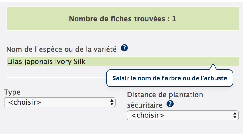 Consultez l’outil Choisir le bon arbre ou arbuste et saisissez « Lilas japonais Ivory Silk » dans le champ Nom de l’espèce ou de la variété, puis cliquez sur Rechercher.