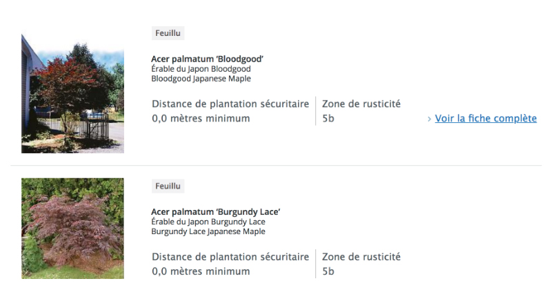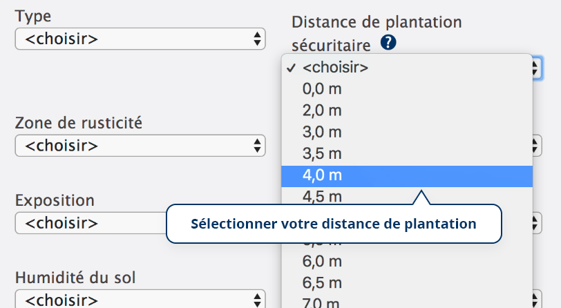 Consultez l’outil Choisir le bon arbre ou arbuste . Dans l’écran de recherche, ne saisissez rien dans le champ Nom de l’espèce ou de la variété, mais sélectionnez plutôt une distance de 4,0 mètres dans le champ Distance de plantation sécuritaire. Choisissez ensuite tout autre critère qui vous intéresse, puis cliquez sur Rechercher.