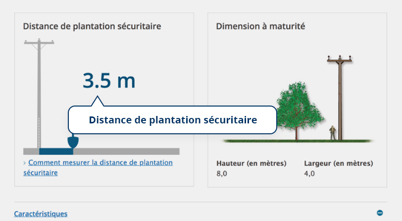 Vous constatez que la distance de plantation sécuritaire pour cette essence est de 3,5 mètres. Vous devez donc planter votre lilas à 3,5 mètres ou plus de la ligne.