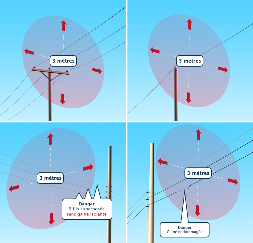 Estimez à l’œil s’il y a un risque qu’une personne, un équipement, un outil ou des branches s’approchent à moins de 3 mètres de ces fils pendant les travaux.
