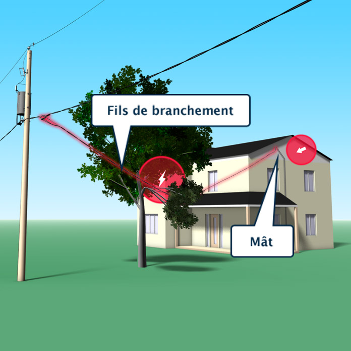 Un arbre ou une grosse branche est tombé ou menace de tomber sur les fils qui relient le réseau à votre résidence (fils du branchement).