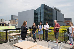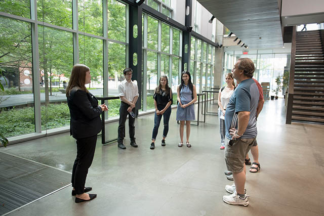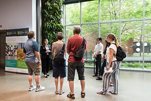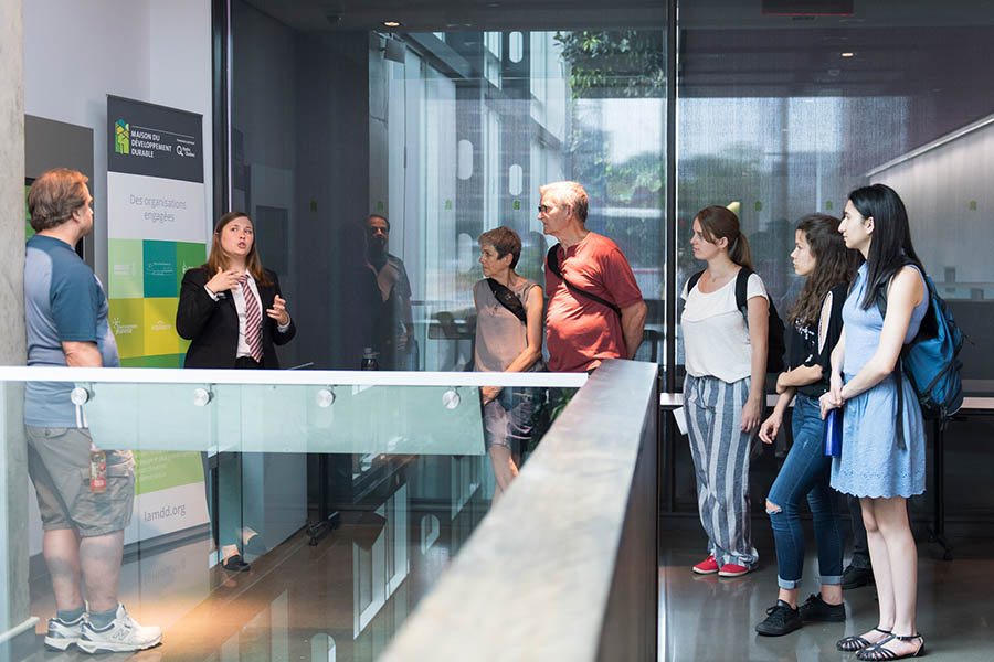 Guide accueillant des visiteuses à l’intérieur de la Maison du développement durable.