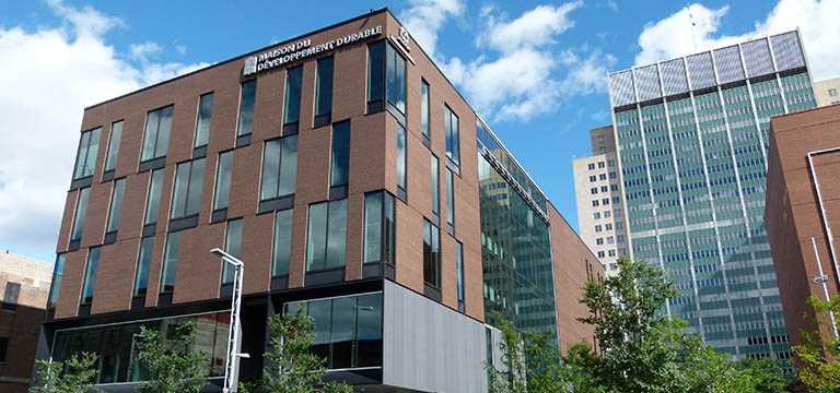 Vue extérieure de la Maison du développement durable et, en arrière‑plan, du siège social d’Hydro‑Québec